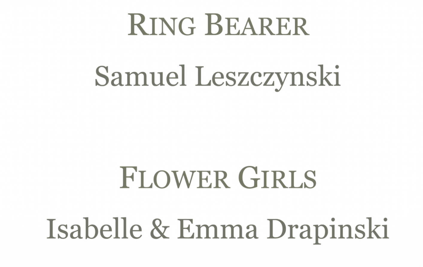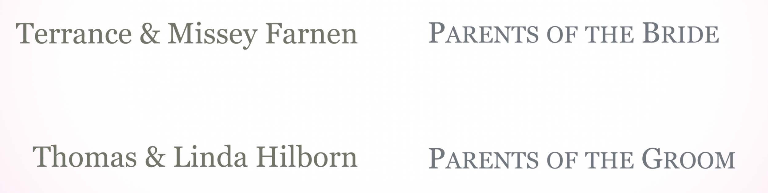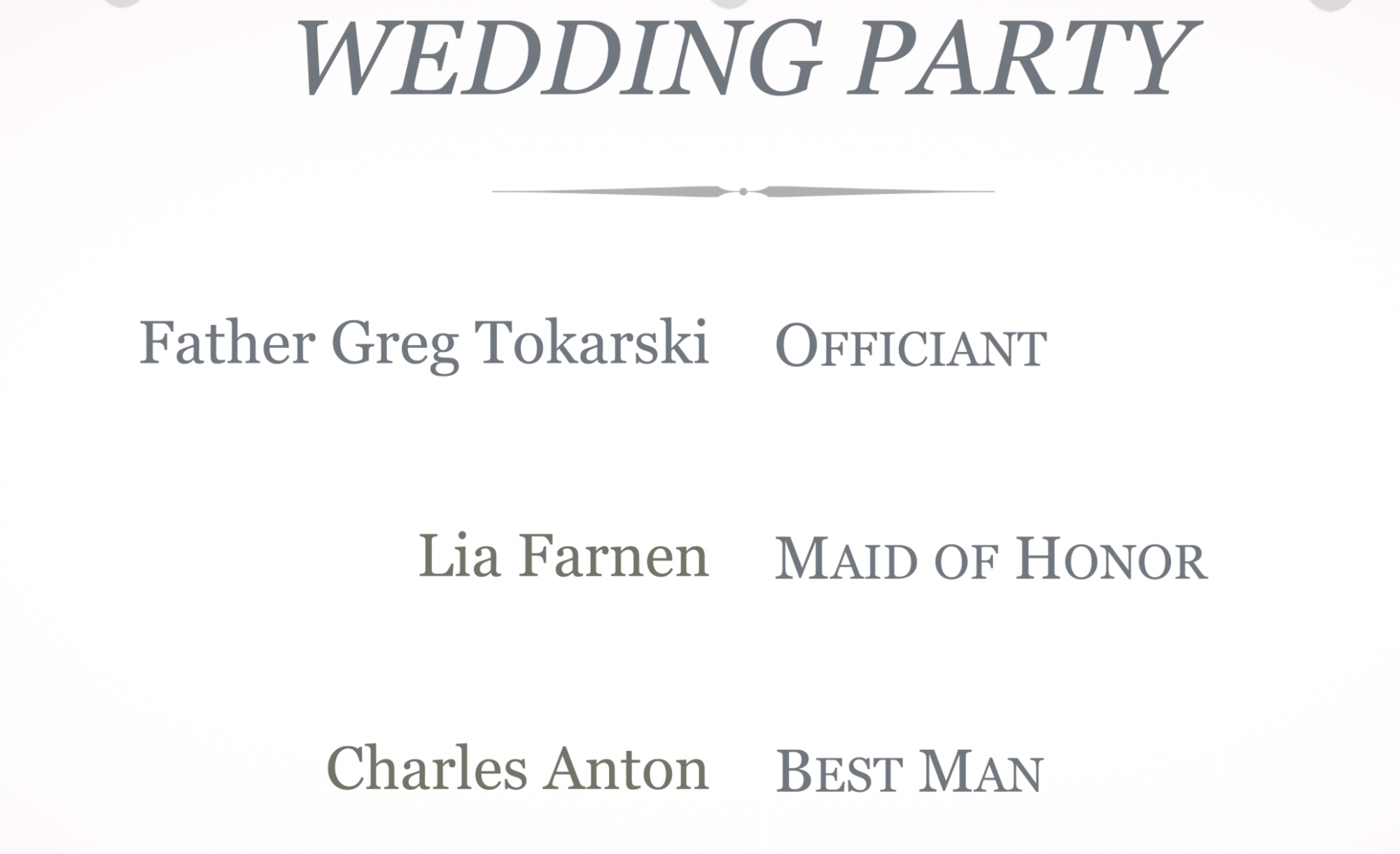 The images below are screen captures from your wedding video! Please look them over to be sure that the correct names are in place and that there are no mispellings or other typographical errors. Simply clink on each image to bring it full screen and the tape the escape key to return to the collection. Please text me when you have done this (with the corrections that are needed, or that i got it all right!) so that I can deliver your final video to you!